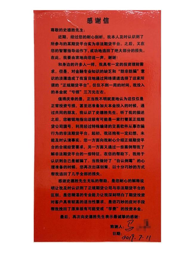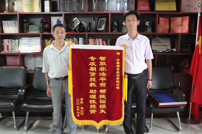 7月11日,安糧期貨股份有限公司收到了投資者親自送來(lái)的感謝信和錦旗,感謝安糧期貨市場(chǎng)部總經(jīng)理史德勝同志幫助他成功挽回了在非法期貨平臺(tái)造成的經(jīng)濟(jì)損失。