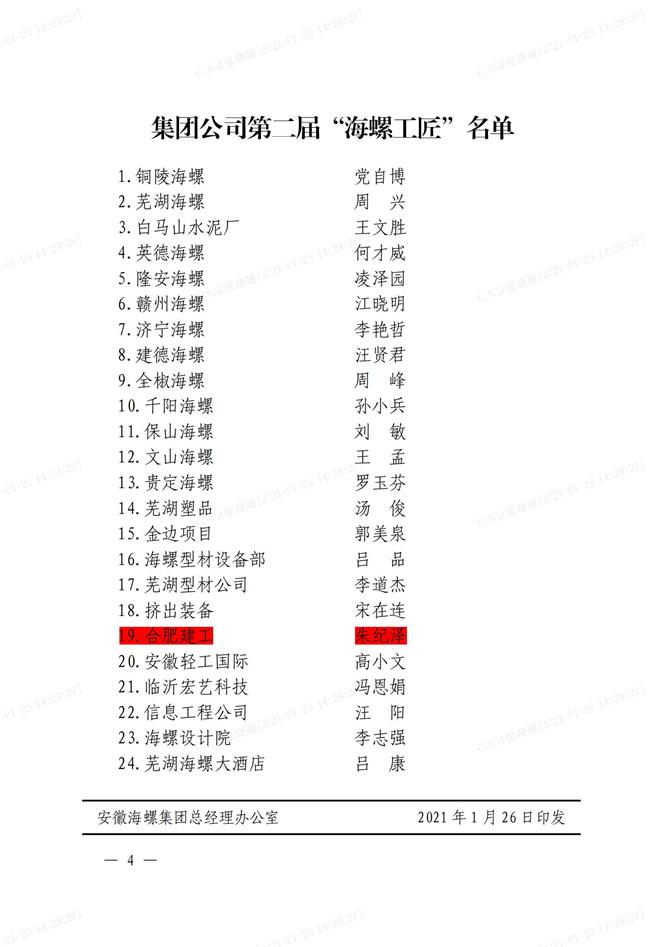 2020年1月26日,海螺集團(tuán)召開(kāi)2021年工作會(huì)議暨第二屆“海螺工匠”表彰大會(huì),授予24名職工“海螺工匠”的光榮稱號(hào)。合肥建工朱紀(jì)澤名列其中,成為安糧集團(tuán)系統(tǒng)內(nèi)首位獲此殊榮的員工。