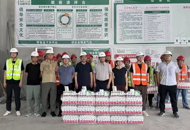 炎炎夏日,酷暑高溫,為切實做好職工夏季防暑降溫工作,用心用情關愛一線職工,8月2日,安糧集團工會開展“關愛職工,夏送清涼”活動,工會主席周洪帶隊來到安糧建設項目工地,對在高溫條件下作業(yè)的職工進行慰問,為奮戰(zhàn)在酷暑一線的工作人員送清涼、送關懷。