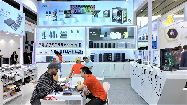 在電子消費(fèi)品類展區(qū),安糧推出了不同款式的散熱機(jī)箱,再加上融入人體工程學(xué)設(shè)計(jì)的配套鍵鼠,能滿足不同PC DIY的需求。此外,大容量、多接口、充電快的移動(dòng)電源,也引得不少意向客戶紛紛下訂。