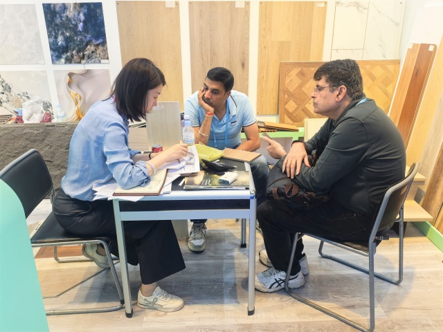 建材展區(qū)中,安糧以差異化策略布局全球市場(chǎng)。UV亮面墻板采用卡扣式快裝結(jié)構(gòu),安裝便捷、節(jié)省工時(shí),深受東南亞客商青睞;為南美、中東定制的3D打印花色與鎏金花紋墻板,支持紋樣和尺寸個(gè)性化定制,滿(mǎn)足高端空間的獨(dú)特審美。