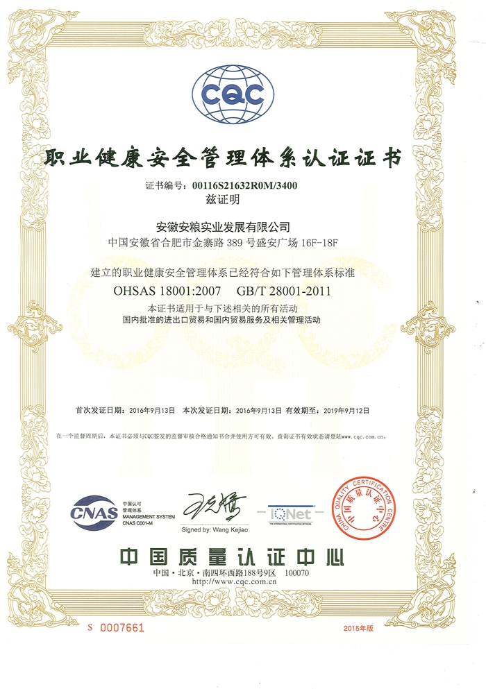 近期,安糧實(shí)業(yè)順利通過中國質(zhì)量認(rèn)證中心審核,在ISO9001認(rèn)證的基礎(chǔ)上又取得了ISO14001環(huán)境管理體系和OHSAS18001職業(yè)健康安全管理體系認(rèn)證證書。證書的獲得標(biāo)志著安糧實(shí)業(yè)建立了完整國際化管理體系,實(shí)現(xiàn)了ISO9001、ISO14001和OHSAS18001三個體系并行運(yùn)轉(zhuǎn),必將促進(jìn)公司生產(chǎn)經(jīng)營活動更上一個臺階。