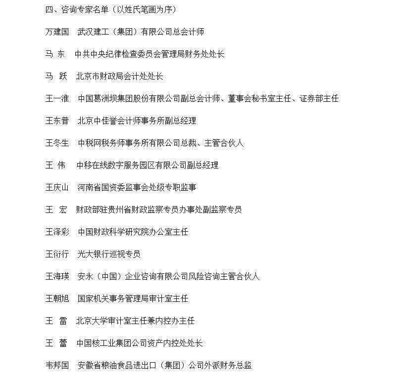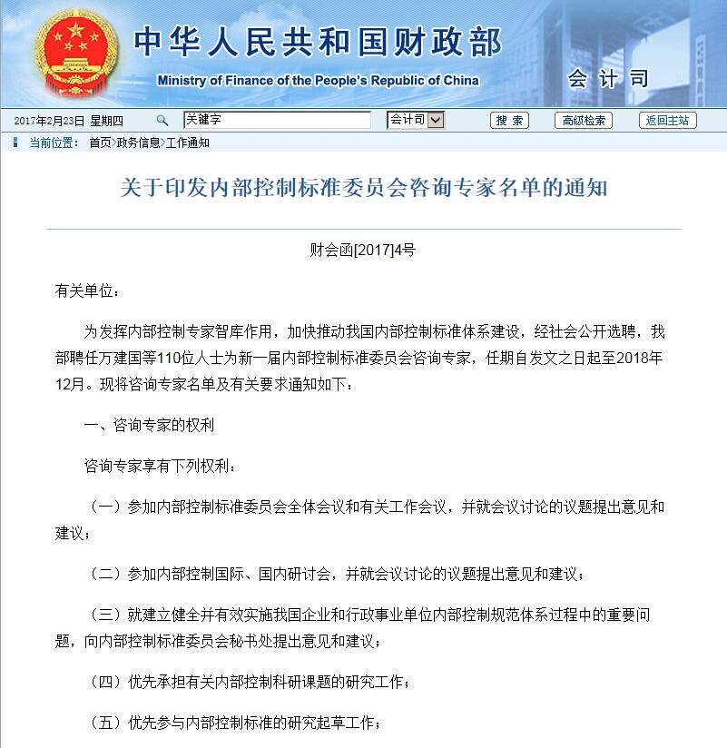 《關(guān)于印發(fā)內(nèi)部控制標(biāo)準(zhǔn)委員會(huì)咨詢(xún)專(zhuān)家名單的通知》 http://kjs.mof.gov.cn/zhengwuxinxi/gongzuotongzhi/201702/t20170215_2535525.html