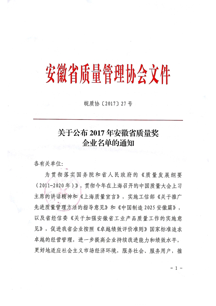 近日,“安徽省質(zhì)量獎(jiǎng)”獲獎(jiǎng)企業(yè)名單正式揭曉,安糧實(shí)業(yè)喜獲“2017年度安徽省質(zhì)量獎(jiǎng)”。這是安糧實(shí)業(yè)繼榮獲"安徽名牌"、"安徽省守合同重信用企業(yè)"等榮譽(yù)后的又一省級(jí)榮譽(yù),映射出安糧實(shí)業(yè)服務(wù)質(zhì)量、產(chǎn)品質(zhì)量的穩(wěn)定以及強(qiáng)大的企業(yè)綜合實(shí)力?!?/span>