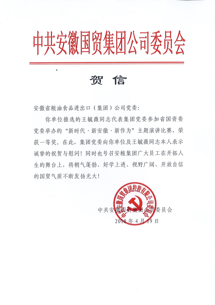 4月19日,安徽國(guó)貿(mào)集團(tuán)黨委發(fā)來(lái)賀電--在省國(guó)資委黨委組織開(kāi)展的“新時(shí)代、新安徽、新作為”主題演講比賽中,我司合肥建工王毓薇代表國(guó)貿(mào)集團(tuán)榮獲一等獎(jiǎng)!