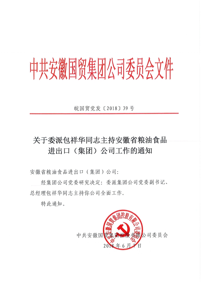 按照會(huì)議安排,首先由李明輝同志受國(guó)貿(mào)集團(tuán)黨委委托宣讀《關(guān)于委派包祥華同志主持安徽省糧油食品進(jìn)出口(集團(tuán))公司工作的通知》,包祥華同志、范陽同志先后講話。