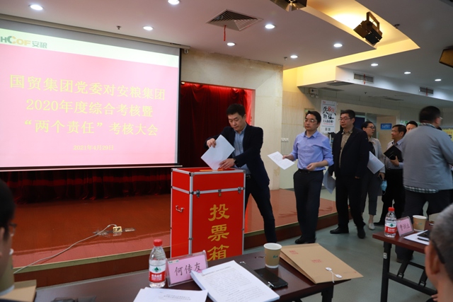根據(jù)國貿(mào)集團黨委統(tǒng)一部署,4月29日,國貿(mào)集團黨委對安糧集團2020年領(lǐng)導(dǎo)班子及領(lǐng)導(dǎo)人員綜合考核暨“兩個責(zé)任”考核大會在盛安廣場五樓多功能廳召開。安糧集團(控股)領(lǐng)導(dǎo)班子成員、本部中層副職以上管理人員、各板塊公司副總以上人員以及職工代表等60多人參加會議。國貿(mào)集團黨委委員、副總經(jīng)理何傳友等考核組成員出席會議。安糧集團黨委副書記、總裁方宗友主持會議。